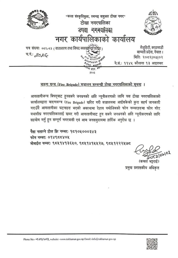 ‘आगलागीजन्य विपद्बाट हुनसक्ने जनधनको क्षति न्यूनीकरणको लागि यस टोखा नगरपालिकाको कार्यालयद्वारा वारुणयन्त्र (Fire Brigade) खरिद गरी सञ्चालनमा आईसकेको कुरा सहर्ष जानकारी गराउँदै आगलागीका घटनाहरु भएको अवस्थामा यथाशीघ्र नगरपालिकालाई खबर गरी आगलागीबाट हुन सक्ने जनधनको क्षति न्यूनीकरणको लागि सहयोग गर्नु हुन सम्पूर्ण नगरबासी एवं आम जनसमुदायमा हार्दिक अनुरोध छ ।’ – टोखा नगरपालिकाका प्रमुख प्रशासकीय अधिकृत कमल भट्टराईले जारी गरेको सूचनामा भनिएको छ ।